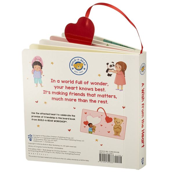 Celebrate the promise of friendship in this new board book from Build-A-Bear Workshop. Use the attached bookmark heart on a ribbon to play along and place the heart on each page. Pair it with a furry friend to make a delightful gift!