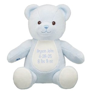 Celebrate the arrival of their newest little cub with this baby blue teddy bear. This cute and cuddly light blue teddy bear is the perfect furry friend for baby’s little paws. Plus, you can personalize this new baby bear to make a one-of-a-kind gift for any bundle of joy!