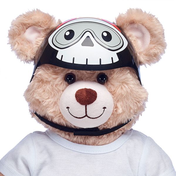 Your furry friend will look ultra-cool in this black stuffed animal helmet! It features a cool design of a skull and flames.