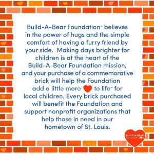 Build-A-Bear Foundation’s mission is to add a little more <3 to life by sharing hugs, inspiring creativity, and supporting those in need.For just $125, your purchase of a commemorative brick will benefit the Foundation and its goal to donate 125,000 furry friends and 125,000 books in 2022!