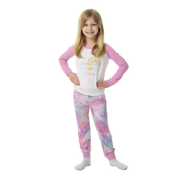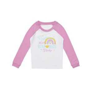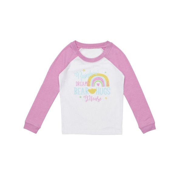 Rainbow dreams and bear hugs please! Little ones can snuggle up to the most colorful of dreams with this pink raglan PJ top. It’s comfy enough to transport anyone to a rainbow dreamland!