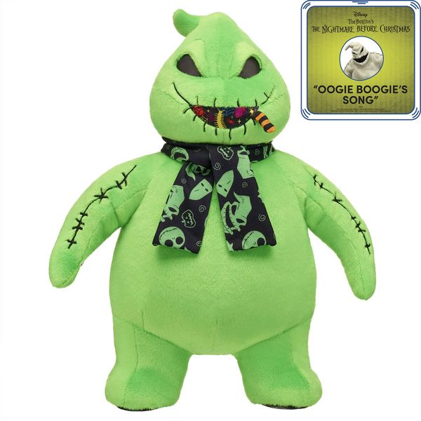 Get into some mischief with Disney’s Oogie Boogie! This mischievous sack from Disney Tim Burton’s The Nightmare Before Christmas has creepy crawlers around his mouth and neon green fur with spooky stitches. This Oogie Boogie plush toy gift set comes with his own scarf and “Oogie Boogie’s Song” included on a sound chip so you can sing along to his signature tune!