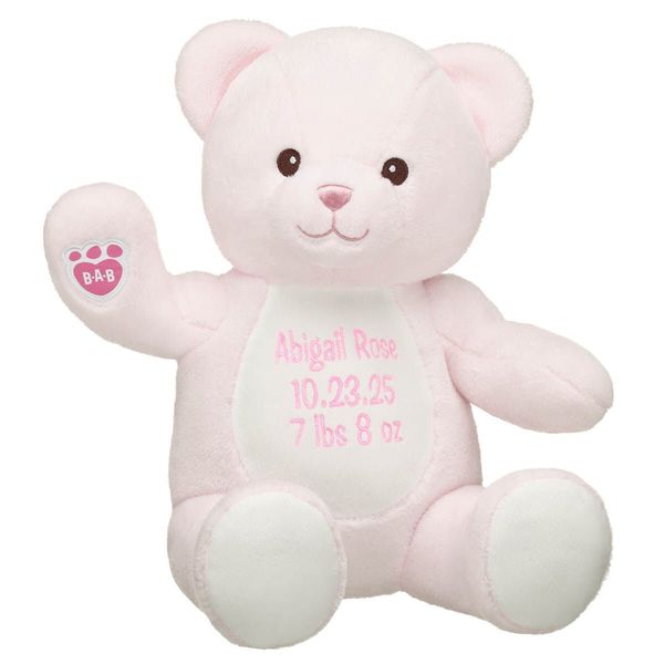 This light pink teddy bear with a customized paw pad is the perfect gift for showering new babies with love! Personalize a gift for your new little cub and add up to 3 lines of embroidery on this sweet pink bear’s paw. Please note: Embroidered items require 1 additional business day for processing. Embroidered items are nonrefundable and cannot be purchased unstuffed. Build-A-Bear reserves the right to refuse requests to embroider profanity; schools, sororities or fraternities; trademarked or licensed names; names of celebrities or professional sports players; or any content that we deem inappropriate, at our discretion.
