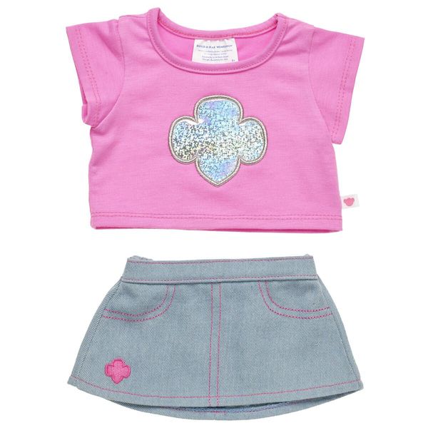 Girl Scout Brownies love learning new things and spending quality time with their Girl Scout sisters. Celebrate all the fun of being a Girl Scout Brownie with this adorable gift set! It features Coconut Caramel Cookie Bear rocking her own trefoil tee, denim skirt, Girl Scout Brownie vest and knot headband. Her own cookie box plush wristie is included as a sweet accessory! Girl Scouts powers life-changing experiences for girls. This is officially licensed by Girl Scouts of the USA, a nonprofit.