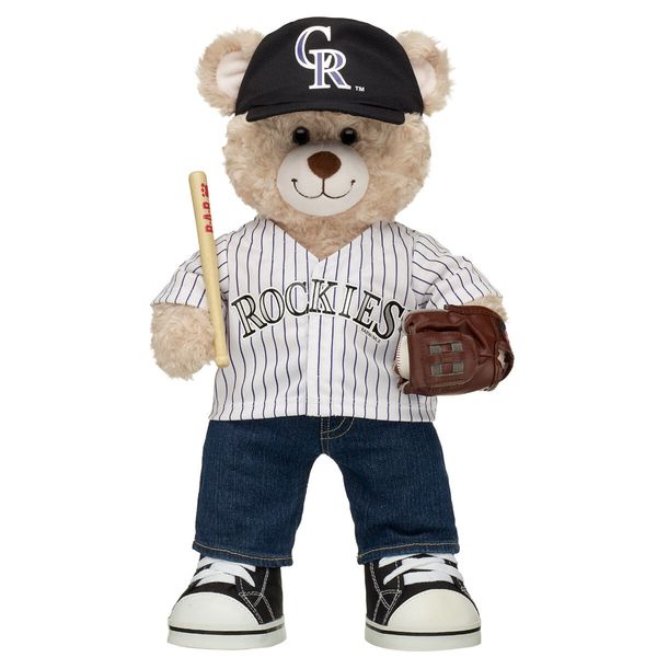 Home run! Root for the Colorado Rockies with the help of this Happy Hugs Teddy baseball bear gift set. This classic teddy bear is repping the Rockies with its baseball hat, team jersey, jeans and shoes included. It even comes with a bear-sized baseball glove, ball and plush bat to make a grand slam of a gift for Rockies fans!