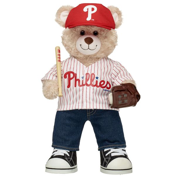 Home run! Root for the Philadelphia Phillies with the help of this Happy Hugs Teddy baseball bear gift set. This classic teddy bear is repping the Phillies with its baseball hat, team jersey, jeans and shoes included. It even comes with a bear-sized baseball glove, ball and plush bat to make a grand slam of a gift for Phillies fans!