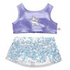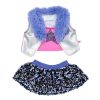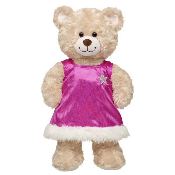 This glittery pink dress for stuffed animals features the Honey Girls silver star emblem and has a white faux fur trim on the bottom.