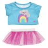 This two-piece stuffed animal outfit includes a purple shirt with rainbows on it and a colorful polka dot skirt.