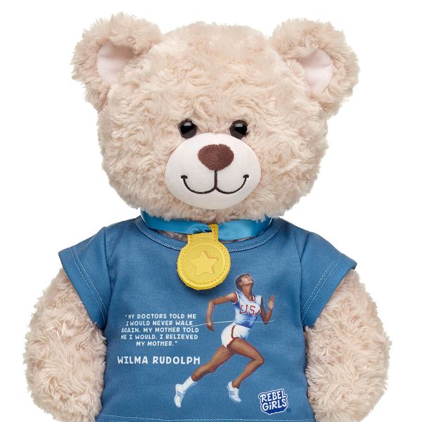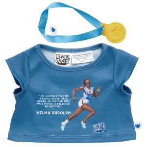 Rebel Girls inspires young girls to learn about the awesome accomplishments of notable women throughout history. This changemaker T-shirt features Wilma Rudolph, the American sprinter who became a world-record-holding Olympic champion and sports icon. Once nicknamed “the fastest woman in the world,” Rudolph was also a civil rights and women’s rights pioneer. Dress Rebel Girls Bear in this motivational T-shirt to give a Wilma Rudolph collectible to any child, educator, athlete or sports fan. The bear can also wear her toy gold medal for an added element of fun.