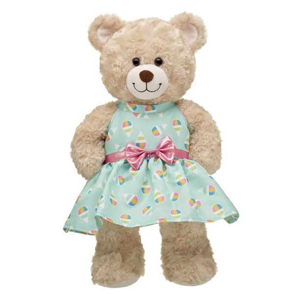 Give your furry friend a sweet sense of style this summer! This pretty stuffed animal dress has a colorful snow cone print pattern with a pink bow around the middle.