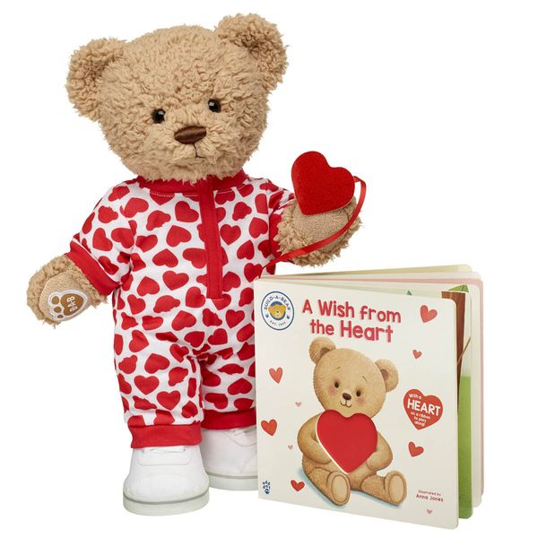 In a world full of wonder, your heart knows best. It’s making friends that matters, much more than the rest! Celebrate the promise of friendship with this “A Wish from the Heart” board book from Build-A-Bear Workshop. Use the attached bookmark heart on a ribbon to play along and place the heart on each page. Timeless Teddy is included to make the perfect cuddly companion for storytime fun! Give this teddy bear with book as a wonderful gift for young readers. Timeless Teddy includes its red hearts PJ sleeper and white shoes. “A Wish from the Heart” book illustrated by Anna Jones.