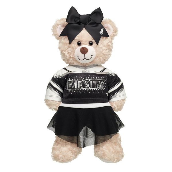 Dress your bear like a true cheerleading all-star in this fun Varsity Spirit cheer uniform! The sparkly All-Star uniform includes a black top with a matching black skirt and hair bow.